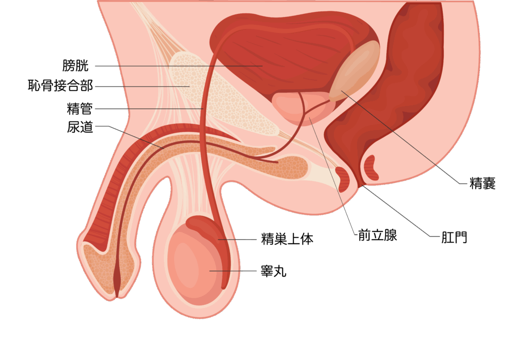 前立腺は男性にのみ存在する臓器で、膀胱のすぐ下、尿道の周囲にあります。小さな栗(くるみ)ほどの大きさ(約20mL)が正常とされ、射精時の精液の一部(前立腺液)を分泌する役割を担っています。